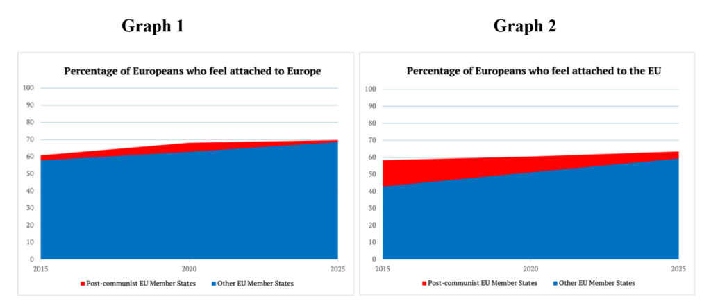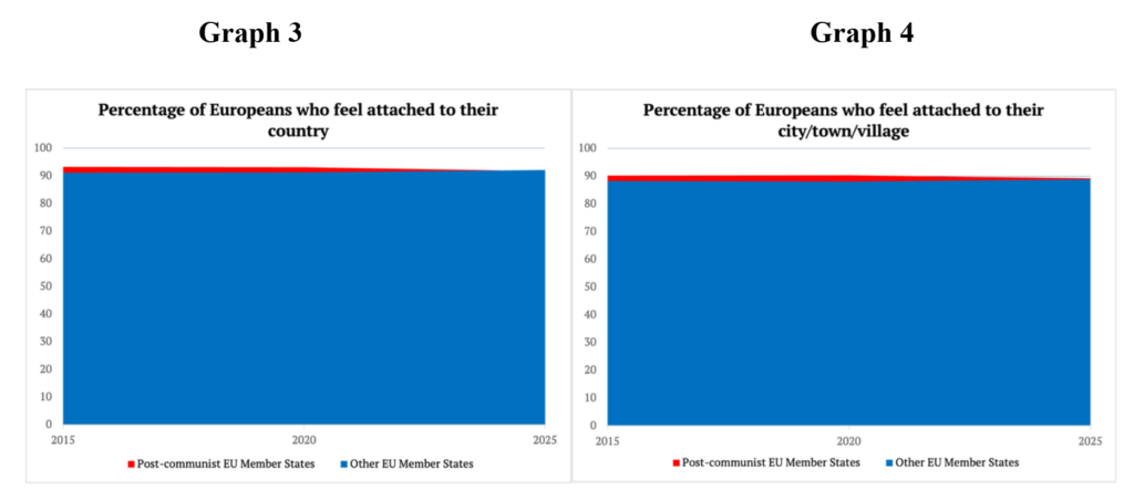 We get a clearer image when attachment to Europe as a concept is separated from the attachment to the European Union as an institution. Attachment to the continent, meaning its culture and broader civilizational community, has been higher in post-communist states throughout the decade; a 3-point lead in 2015, peaking at 5 points in 2020, and narrowing to just 1 point in 2025, all while overall EU-Wide levels continue to grow. (See: Graph 1)
