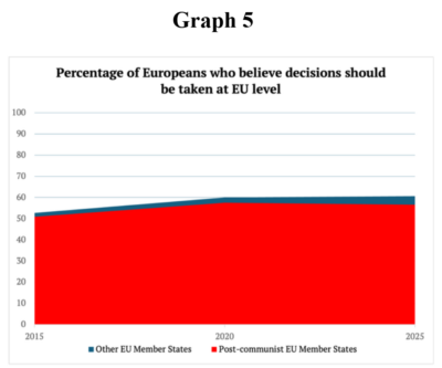 The puzzle is completed by a third dataset: support for more decision-making to happen at the EU level. Here, post-communist states consistently trail slightly behind. The gap was 2 percentage points in both 2015 and 2020, and widened to 4 points by 2025, even as overall EU-wide support for centralized EU governance grew, rising from roughly 53% to 61% in non-post-communist states, while post-communist support grew more slowly and plateaued at around 57% (See: Graph 5)