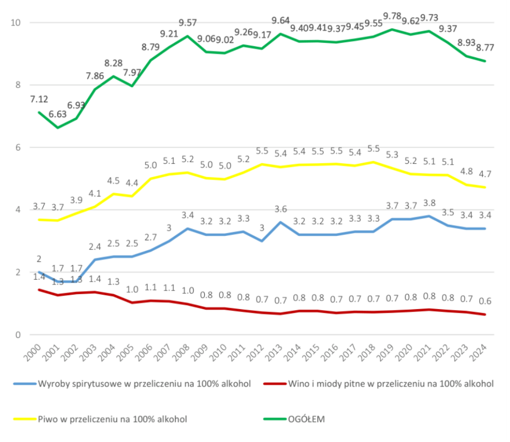 Figure 1: Recorded alcohol consumption in Poland (litres of pure alcohol per resident), 2000-2024