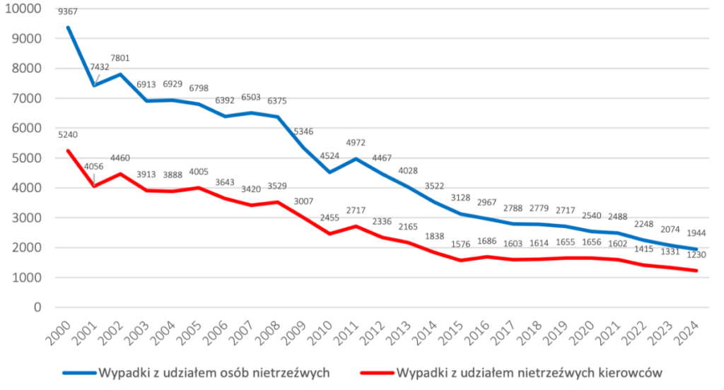 At the beginning of the 21st century, there were 7-9 thousand accidents per year involving intoxicated persons, representing 14-16% of all road accidents in Poland. Today, it is fewer than 2 thousand accidents and below 10% of all accidents. Accidents involving intoxicated drivers accounted for 8-9% of all road accidents in 2000-2006, and today they are below 6%.