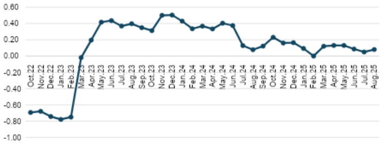 The aggregate industry outlook indicator, which measures short-term expectations, rose to 0.14 — the highest level since April 2024. Production expectations surged most significantly, from 0.38 in July to 0.49 in August, driven by an increase in the share of optimists from 39% to 46.8%, while the share of pessimists remained steady at just over 4%. Export expectations followed a similar trend, reaching a value of 0.48.