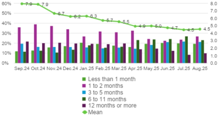 At the same time, the average duration of order portfolios stabilized at 4.5 months, with 10% of firms now holding contracts lasting one year or more. The wood-processing industry leads with the longest order books (5.3 months), while construction materials firms have the shortest (2.2 months).