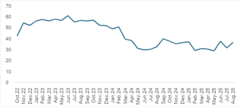 Inflation expectations are rising again. The share of firms observing price increases for raw materials jumped from 26.4% in July to 35.8% in August. At the same time, 40.6% expect further price growth, up from 38.9%. For finished goods, 36.7% of businesses reported higher prices (versus 29.6% in July), while 40% anticipate continued growth. This inflationary environment compounds uncertainty, particularly in industries that are heavily reliant on imported inputs or energy-intensive processes.