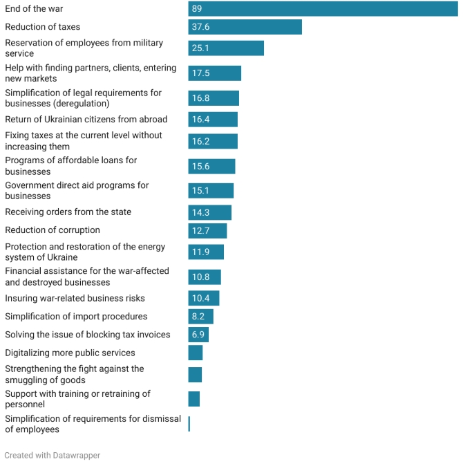 Other priorities include support for entering new markets, partner and client search, deregulation, return of Ukrainians from abroad, tax freezes, affordable loans, and direct budgetary support programs.