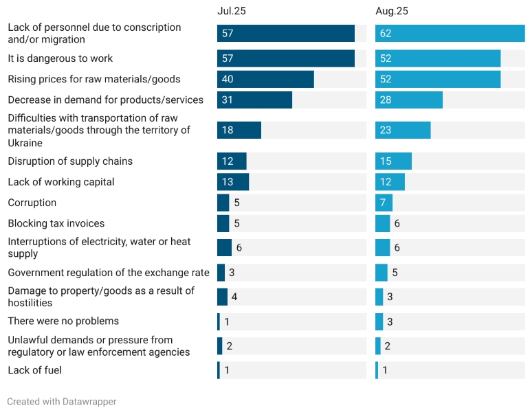 Labor shortages have worsened: the share of firms reporting difficulties in finding qualified workers rose from 44.8% in July to 50.1% in August. By contrast, problems with unqualified labor remained stable at around 36%. The primary cause remains mobilization and outmigration. Shortages of workers have grown by 5 percentage points to 62%, making it the most significant barrier to business.