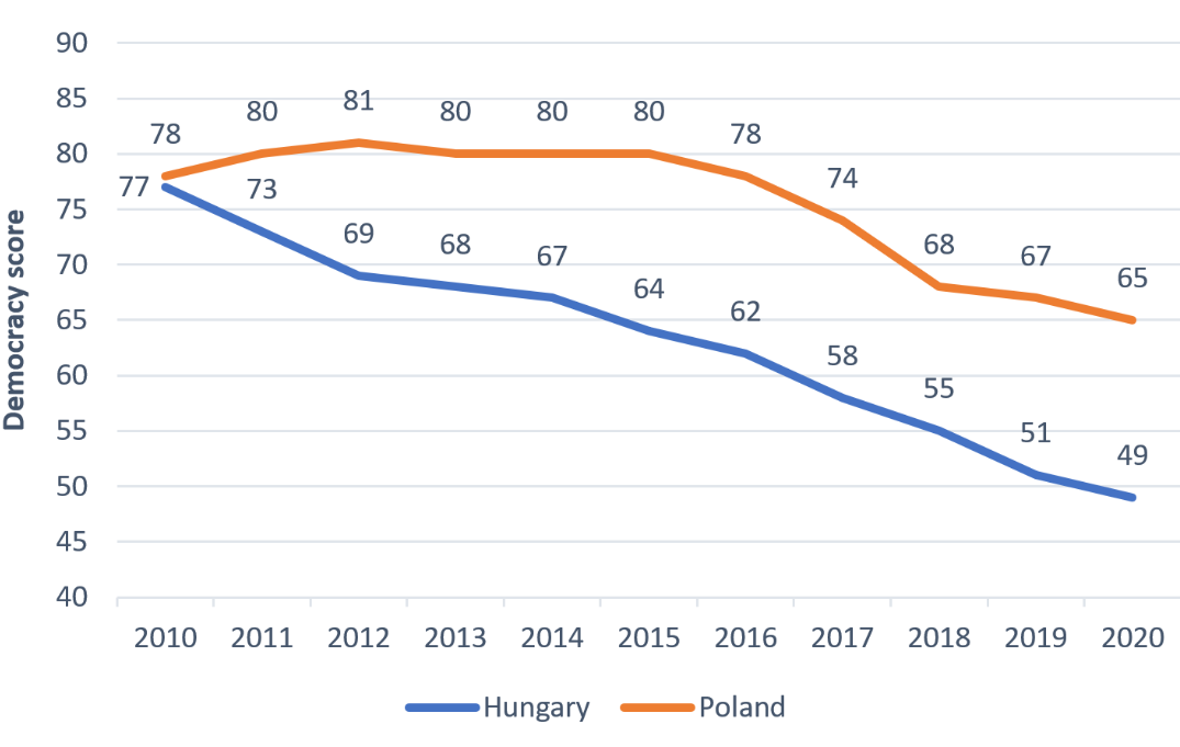 Figure 1: Freedom House democracy score in Hungary and Poland from 2010-2020