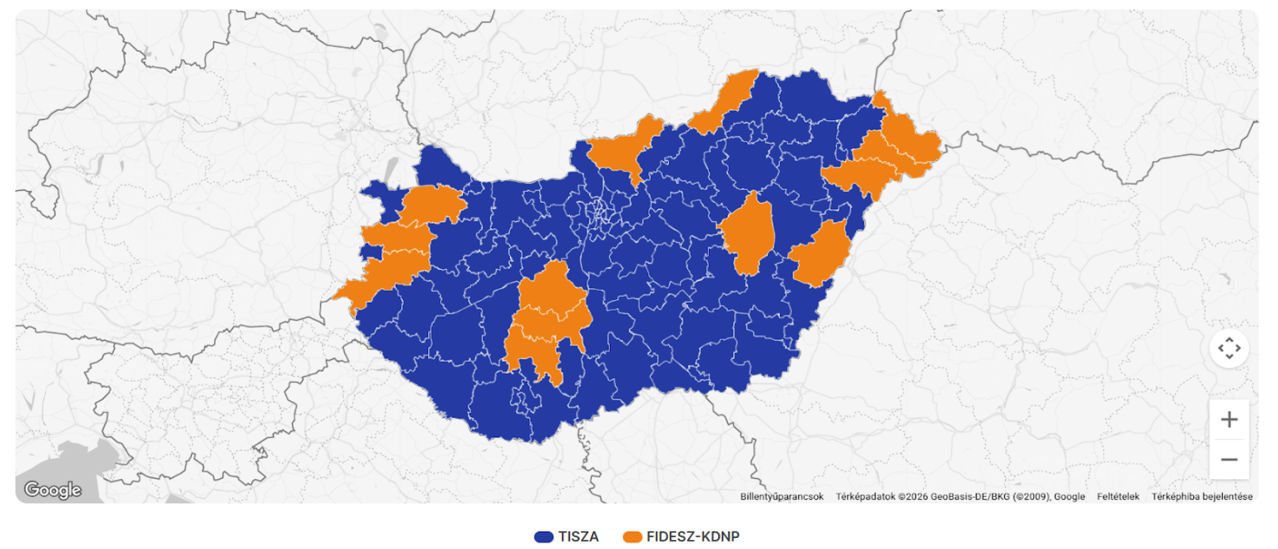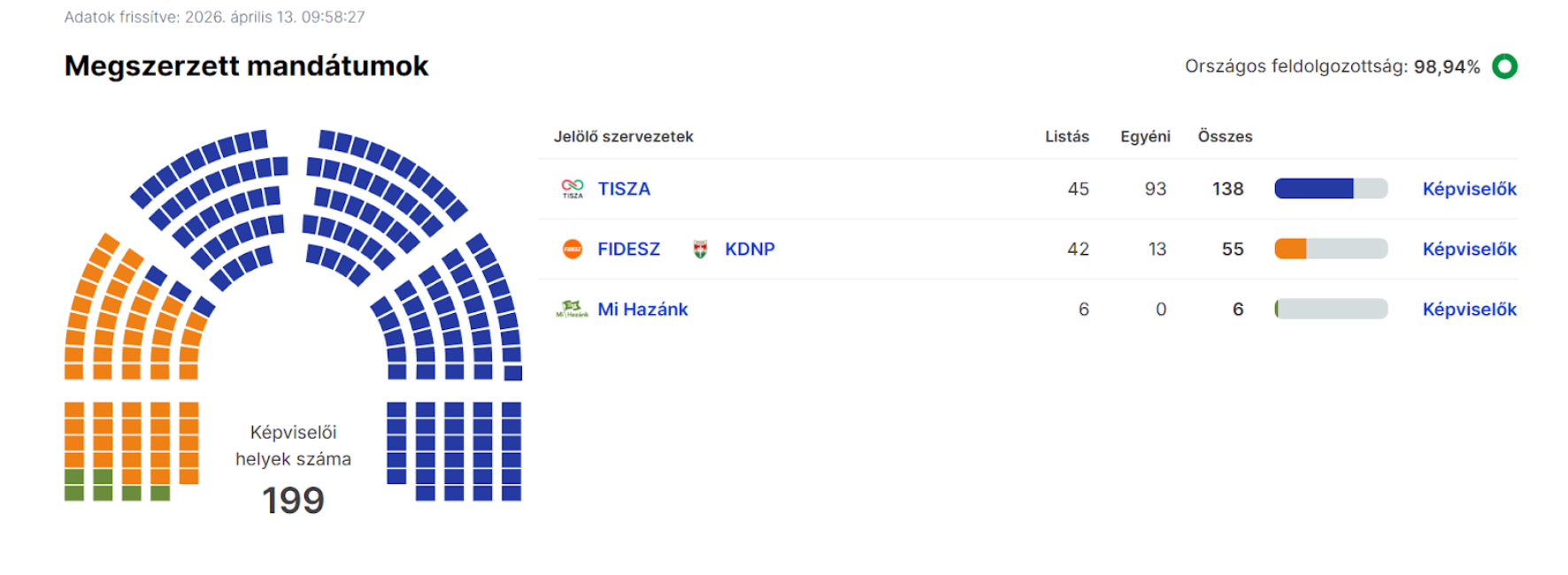 With 98.93% of the votes counted (excluding absentee ballots), the results are as follows: the Tisza Party is projected to secure 138 seats, having garnered over 3 million votes. At the same time, the Fidesz-KDNP coalition is expected to receive 55 seats, their number of votes amounting to about 2 million and 250 thousand votes. Mi Hazánk is the only smaller party managing to surpass the 5% entry threshold, projected to gain 6 seats in the Hungarian Parliament.