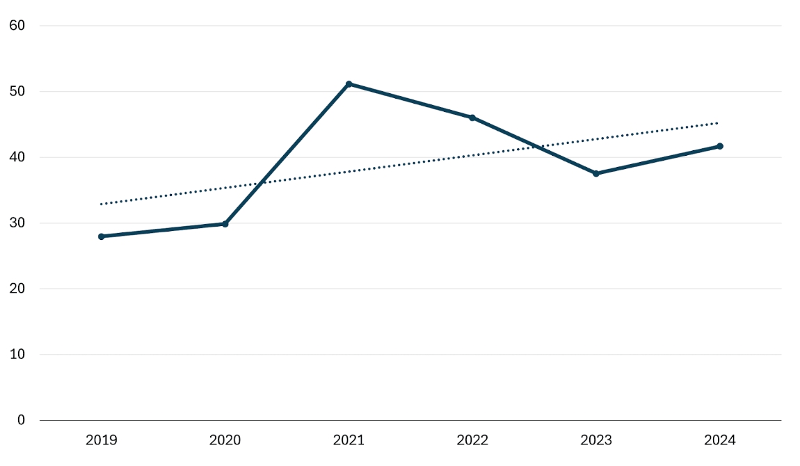 EUDA also publishes studies on the presence of drug residues in wastewater (European Union Drugs Agency 2025b). In the case of marijuana, the indicator analyzed is THC-COOH, and results are expressed as the number of milligrams of metabolites per 1,000 people per day. This approach also has its limitations: it is difficult to estimate the impact of so-called “drug tourism” and the medical use of marijuana on the results. In the international data published by EUDA, only one Polish city is included—Kraków. For this city, the presence of marijuana metabolites shows an upward trend (Figure 3).
