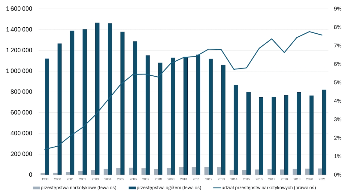 Between 1999 and 2021, the total number of recorded crimes fell by 27%, representing a major success of Poland’s political and economic transformation and clear evidence of an improvement in state performance. At the same time, the number of recorded drug-related offences increased by as much as 298%. The share of drug offences in total crime has been rising (Figure 6). This points to the profound ineffectiveness of the current legal framework—under conditions of declining overall crime, one would expect drug-related crime to decrease as well.