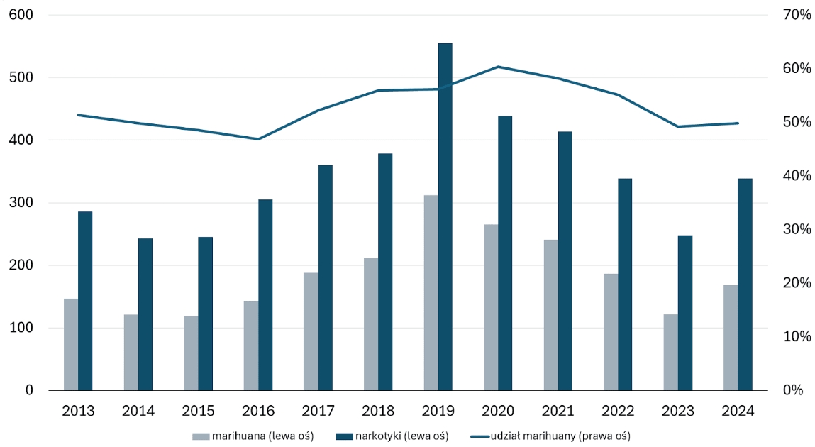 There is also another dimension of recreational marijuana consumption: medical marijuana. Some users likely obtain cannabis via prescription despite not needing it for medical purposes. This is a consequence of the lack of access to legal recreational marijuana—people choose a less risky alternative. However, it is difficult to estimate what share of medical marijuana consumption is in fact recreational. In 2023, as many as 276,807 prescriptions were issued for over 4.6 tones of medical marijuana, representing a significant increase compared to previous years.