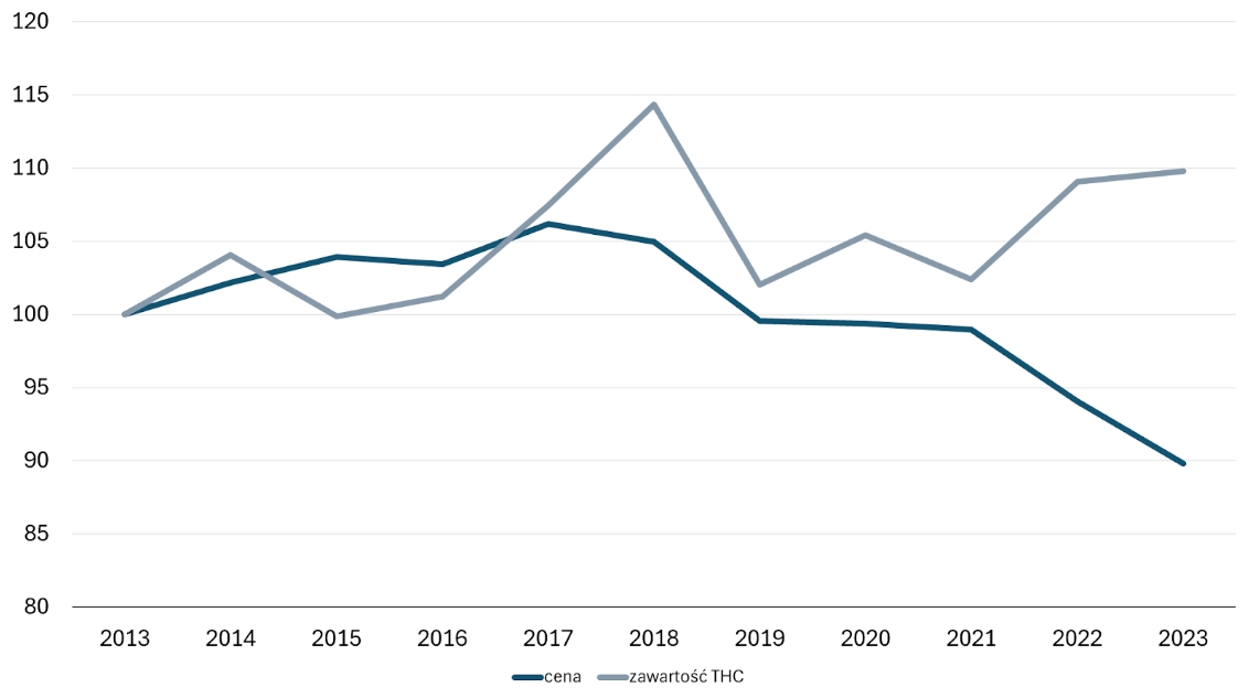 An increase in the potency of psychoactive substances combined with a decline in quality may lead to overdoses or poisonings. In the case of marijuana, these risks can take the form of adverse effects such as psychotic disorders or memory impairment. Once again, it is difficult to find Poland-specific data; however, conclusions drawn from EUDA estimates are not reassuring. Between 2013 and 2023, the price of marijuana fell by more than 10%, while THC content increased by nearly 10% (Figure 9). This situation is unfavorable for users – it is possible to purchase higher-potency marijuana at a lower price, which increases the risk of adverse effects. An even greater threat to users themselves is the addition of other substances to black-market marijuana. For example, in Canada, high levels of pesticides were detected in samples of illegal marijuana (92% of samples, compared with only 6% in the legal market; Gagnon et al. 2023).
