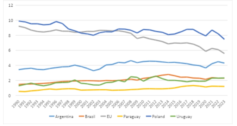 When examining the relationship between economic growth and greenhouse gas emissions (see Chart 11), one can observe some potential. In Poland (to a large extent) and in the EU, a phenomenon known as “decoupling” has occurred – the separation of economic growth from emissions. However, in the case of Mercosur countries, this phenomenon is not yet as strong – Brazil, in particular, remains a greenhouse gas–intensive economy. Although the trend is downward (over the long term, these countries are reducing the emission intensity of their economies), it is too slow and too unstable.