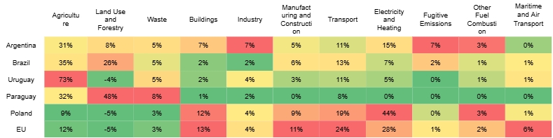 As experience shows, this process can be reversed through policy changes. In this regard, cooperation between the blocs may prove helpful – they can learn from each other and implement green solutions. Individual countries differ significantly in terms of their emissions profiles (see Table 1). This results from both environmental conditions and structural differences between the economies themselves, for example, the greater role of agriculture in South America.