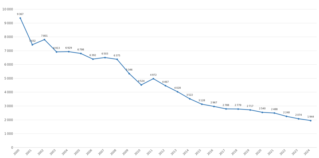 Figure 2: Road accidents in Poland involving intoxicated persons, 2000–2024.