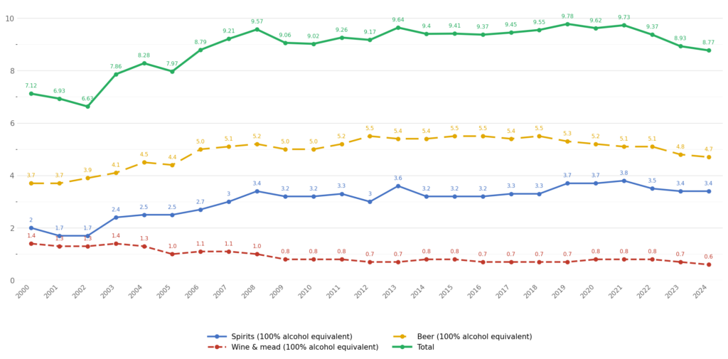 Figure 1: Consumption of individual alcoholic beverages per person of litres of pure alcohol, 2003–2024.